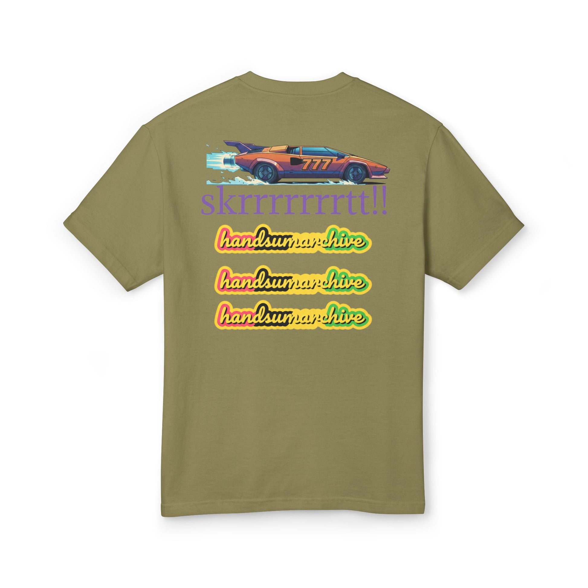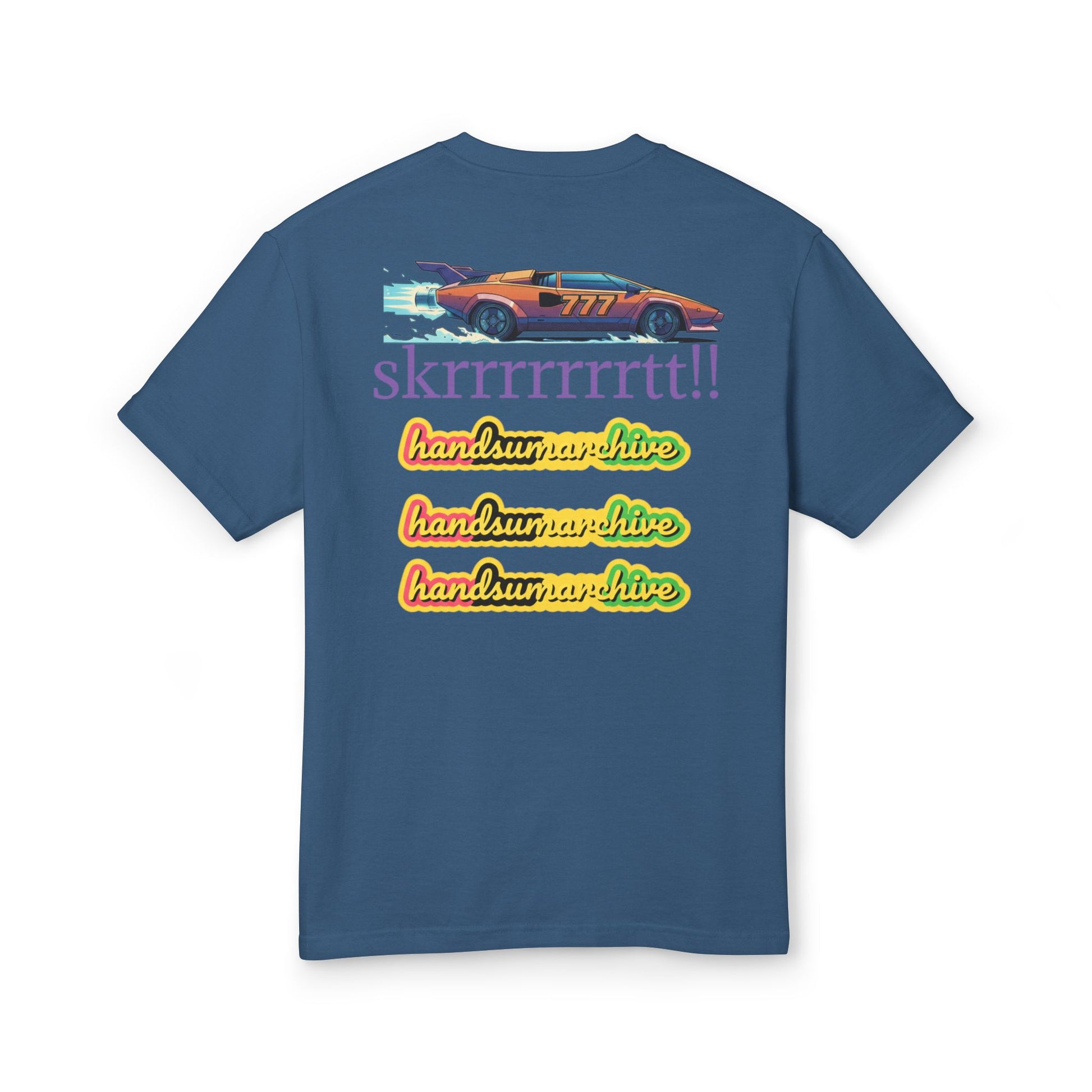 This heavyweight cotton tee carries a playful, vintage-sport energy—like a well-loved racer jacket translated into soft, garment-dyed cotton. Front and back graphics mix a glossy heraldic badge (a golden, slightly cheeky bull) with a retro racecar and layered script on the back: bold “skrrrrrrrtt!!” text and stacked neon-style “handsum archive” repeats. It feels worn-in straight away: the dye gives subtle depth and texture while the roomy, relaxed cut keeps movement easy. Wear it to slow down at a car meet, stand out on an urban walk, or layer under a jacket when the evening cools—this tee brings color, attitude, and a crafted vintage look to everyday wear.