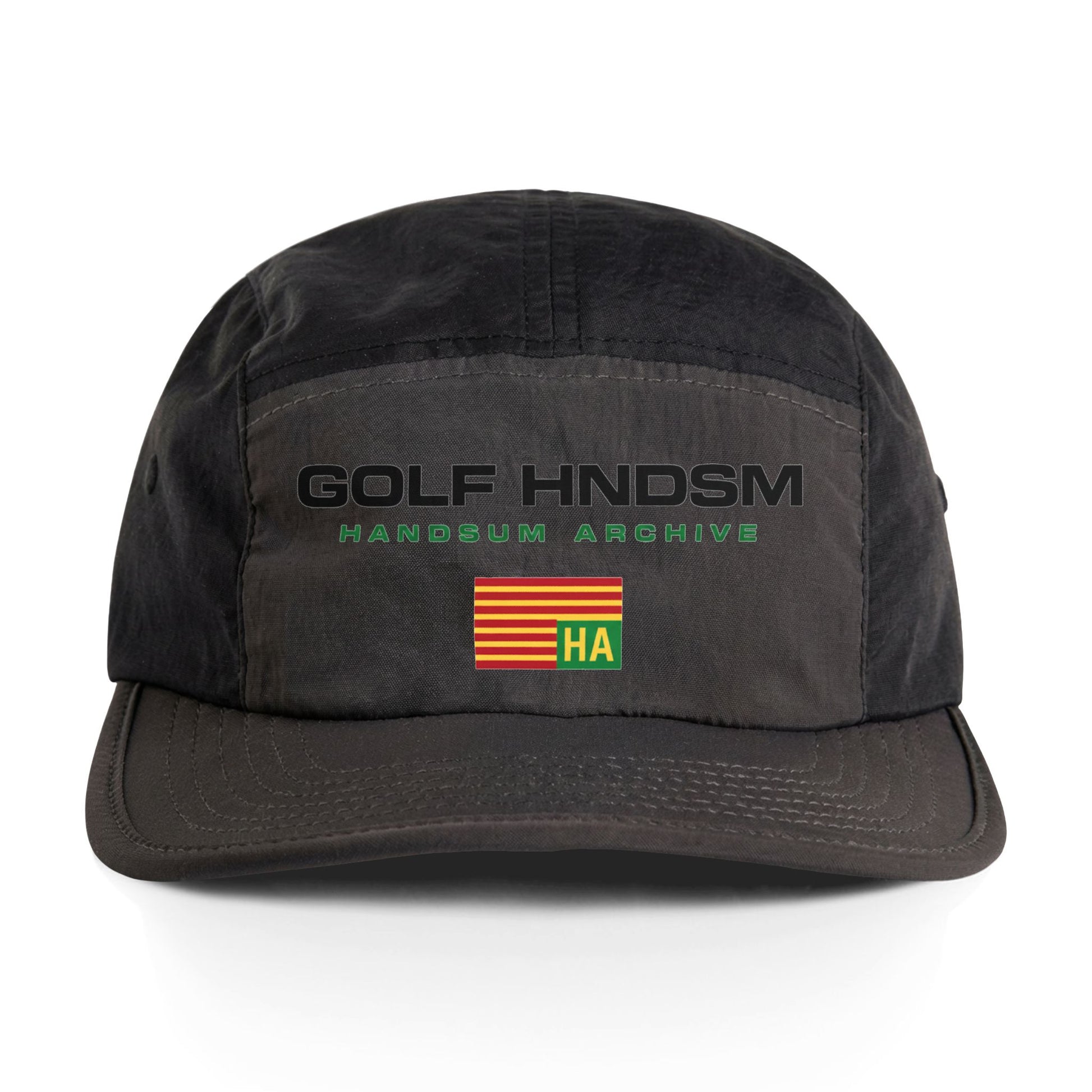 Light on the head and heavy on character. This low-profile five-panel cap slips into days spent moving — early-morning drives to the course, windy walks by the green, or errands that need a little extra edge. The quick-dry recycled nylon breathes and sheds moisture, so the cap stays comfortable when the pace picks up. Contrast panels and a stitched archival logo give it a vintage-sport vibe that reads both relaxed and intentional. An adjustable snap and elastic straps make fit effortless, while the tear-away label keeps the interior clean. Wear it with a faded polo or a weathered windbreaker and it feels like part of the routine — subtle, durable, and quietly considered.