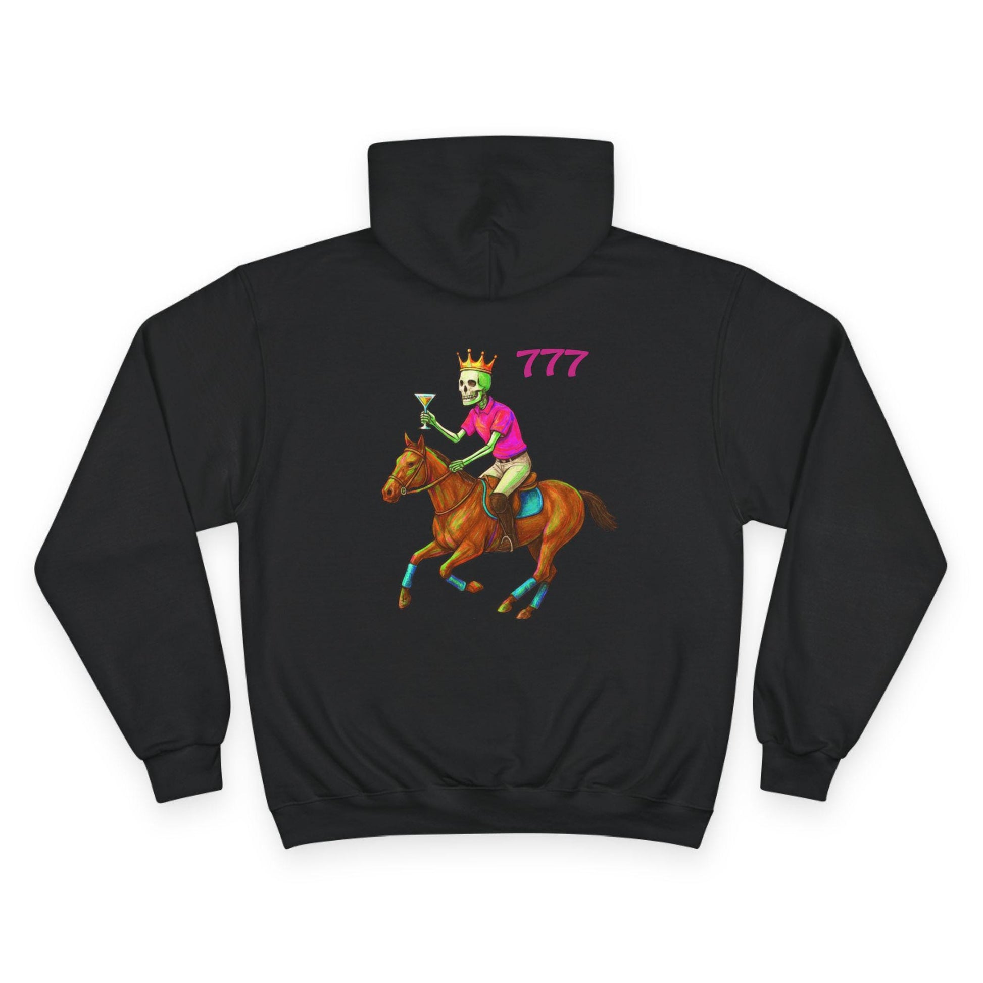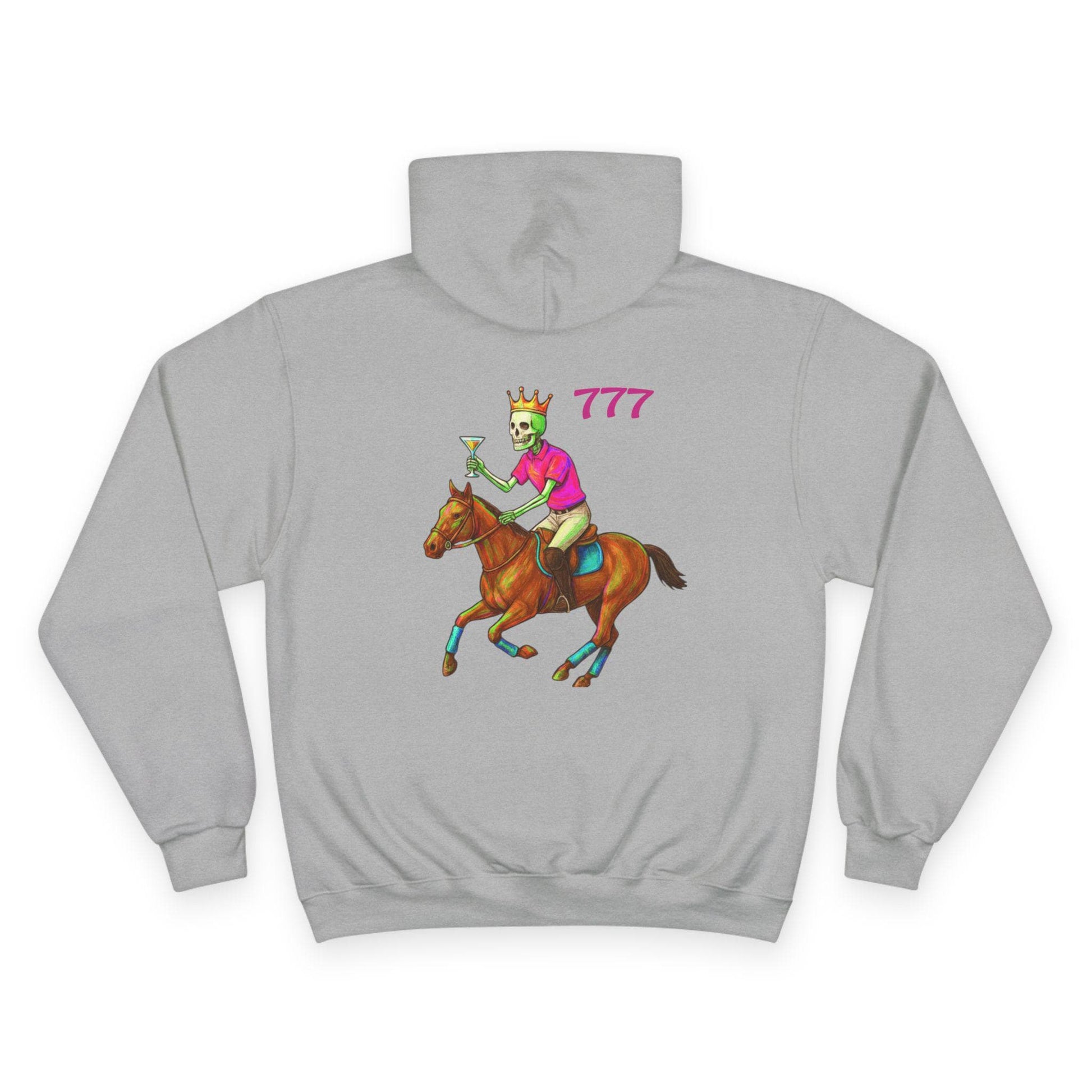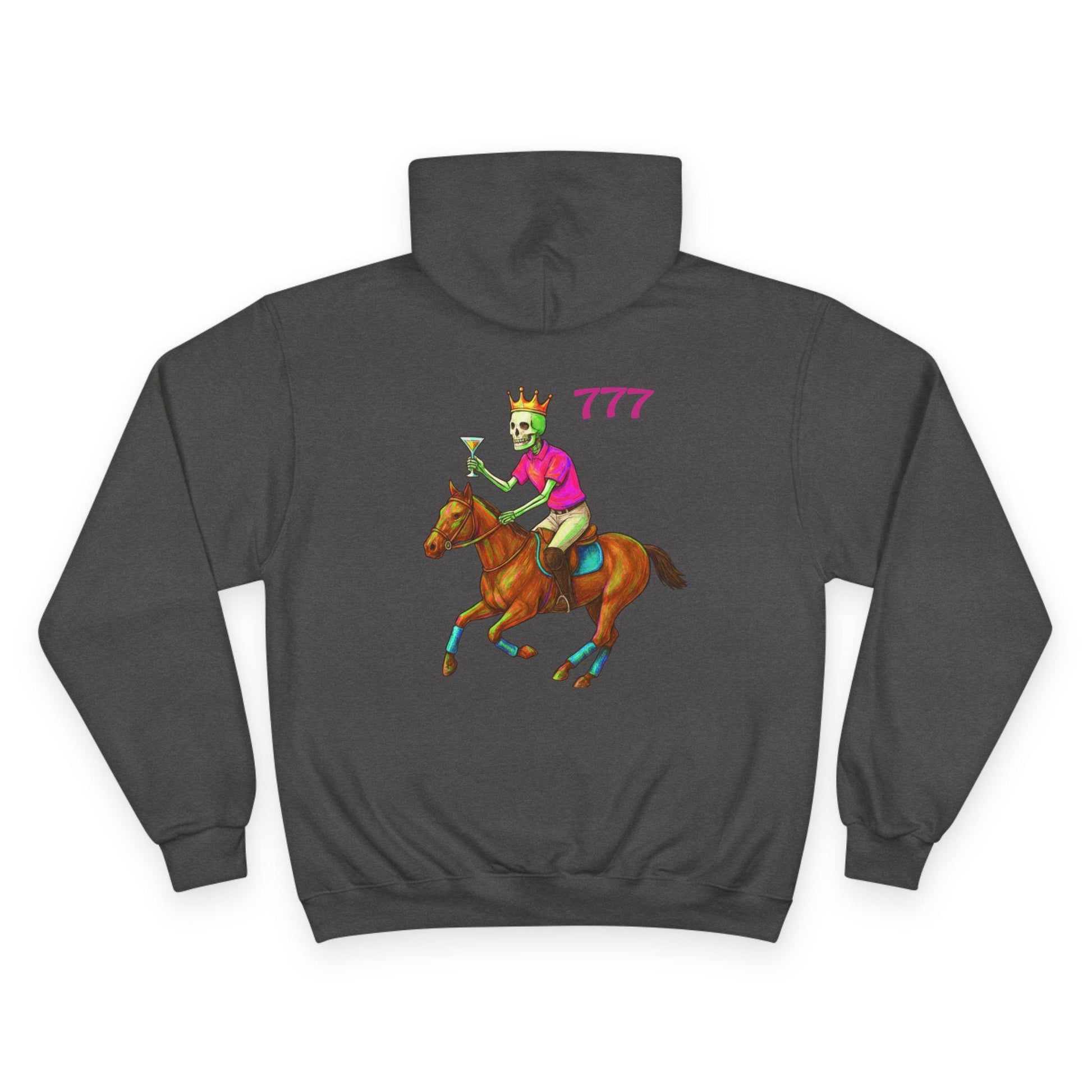 This cozy Champion hoodie brings playful, vintage-styled racing art into everyday wear. The front features a colorful circular patch graphic with a tropical sunset and palm silhouettes, giving off relaxed explorer energy. On the back, a bold illustration of a crowned jockey riding full stride adds a cheeky, confident vibe—number “777” sits above like a lucky charm. The midweight fabric and laid-back fit make this hoodie feel lived-in from day one. Wear it on cool mornings, at weekend meetups, or when you want a standout layer that tells a story without saying too much.