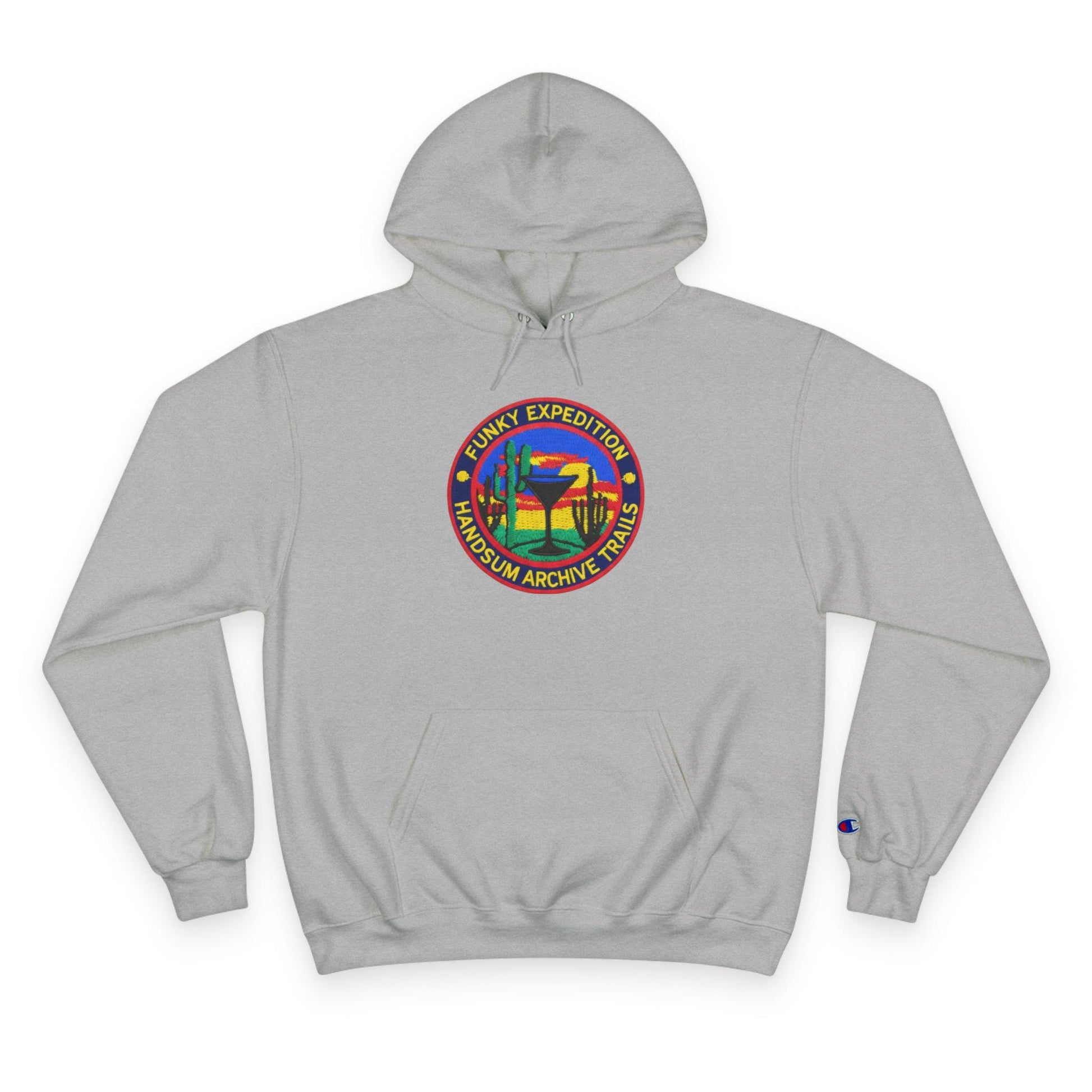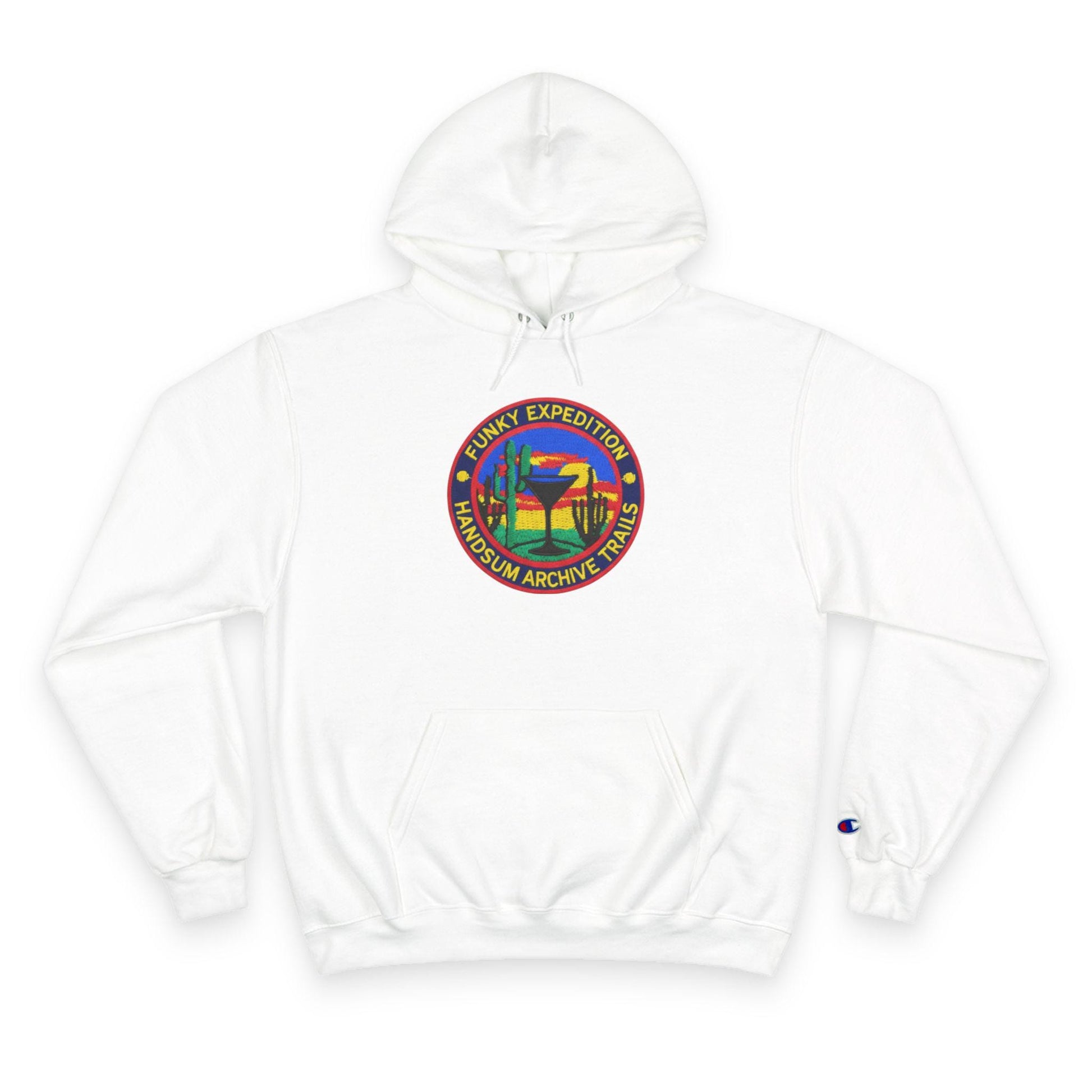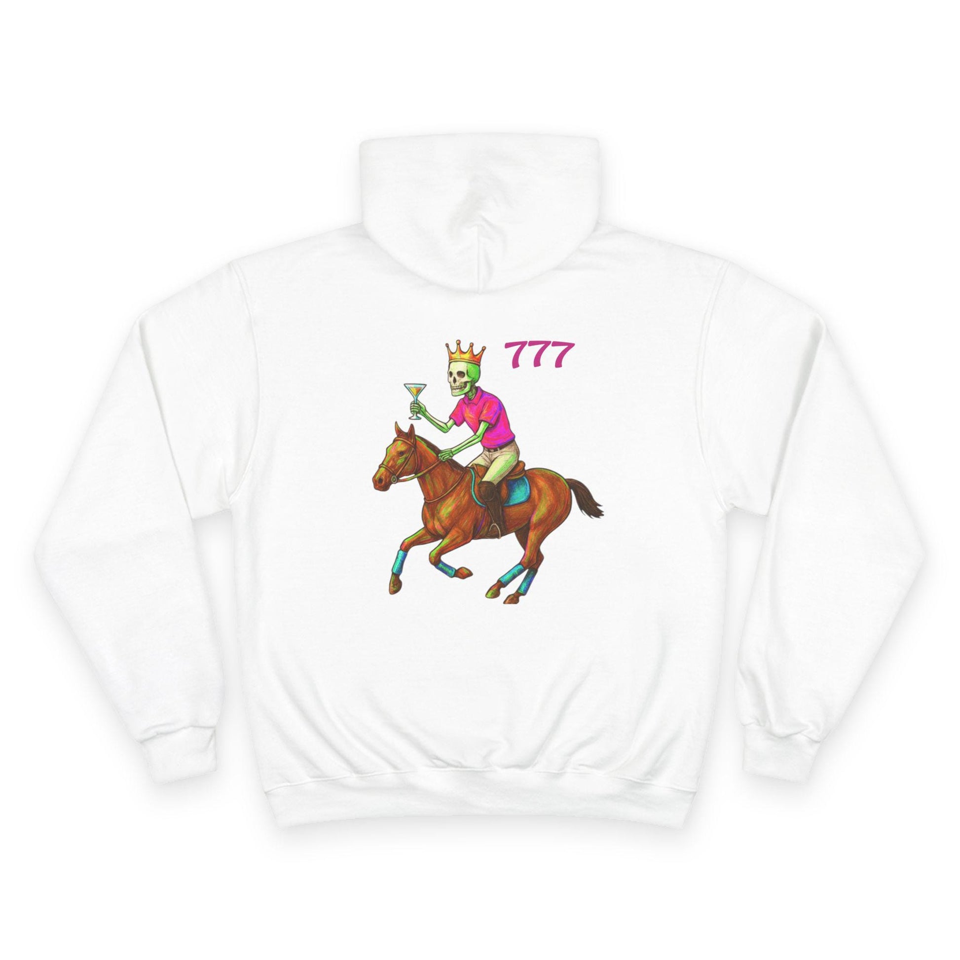 This cozy Champion hoodie brings playful, vintage-styled racing art into everyday wear. The front features a colorful circular patch graphic with a tropical sunset and palm silhouettes, giving off relaxed explorer energy. On the back, a bold illustration of a crowned jockey riding full stride adds a cheeky, confident vibe—number “777” sits above like a lucky charm. The midweight fabric and laid-back fit make this hoodie feel lived-in from day one. Wear it on cool mornings, at weekend meetups, or when you want a standout layer that tells a story without saying too much.